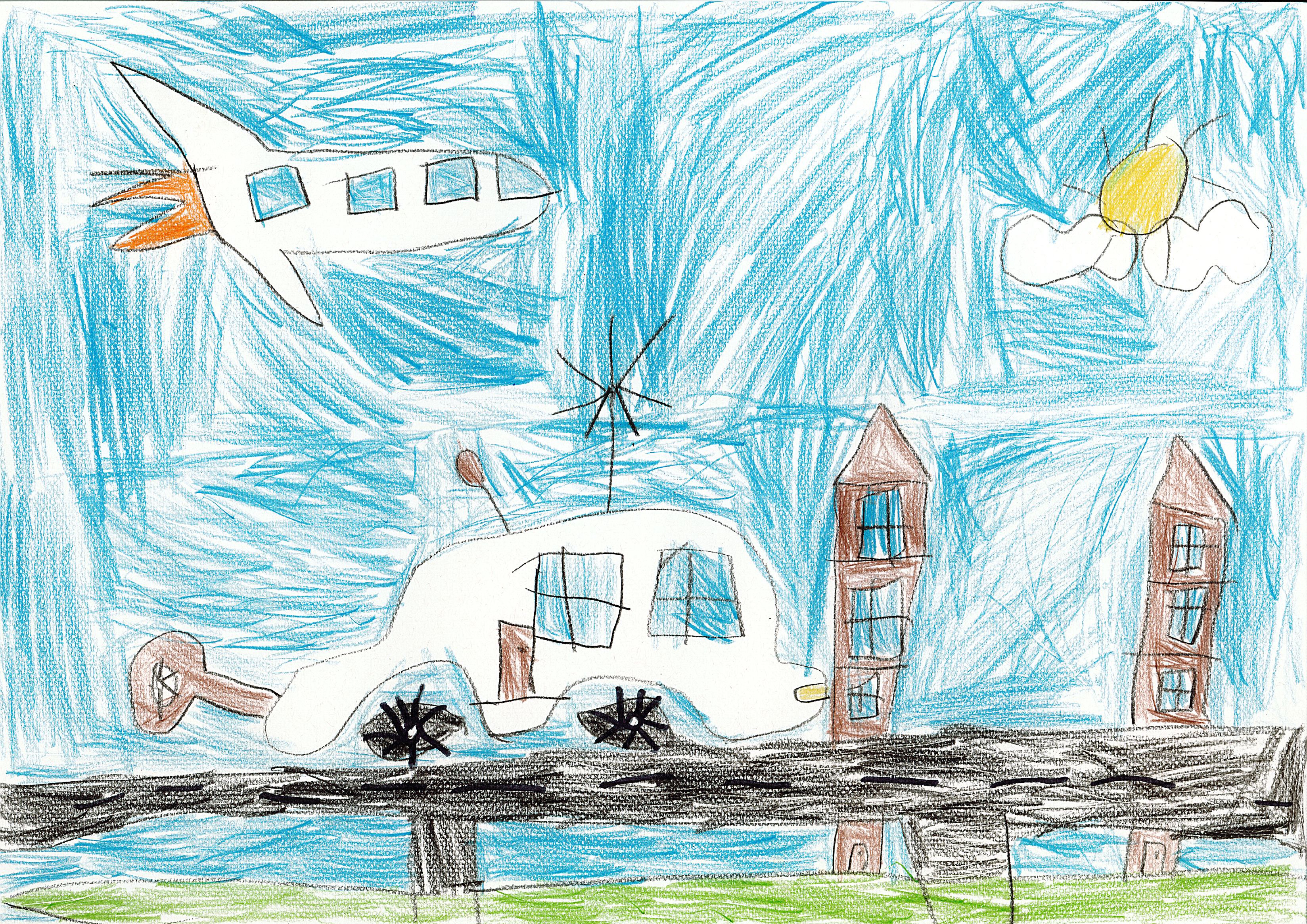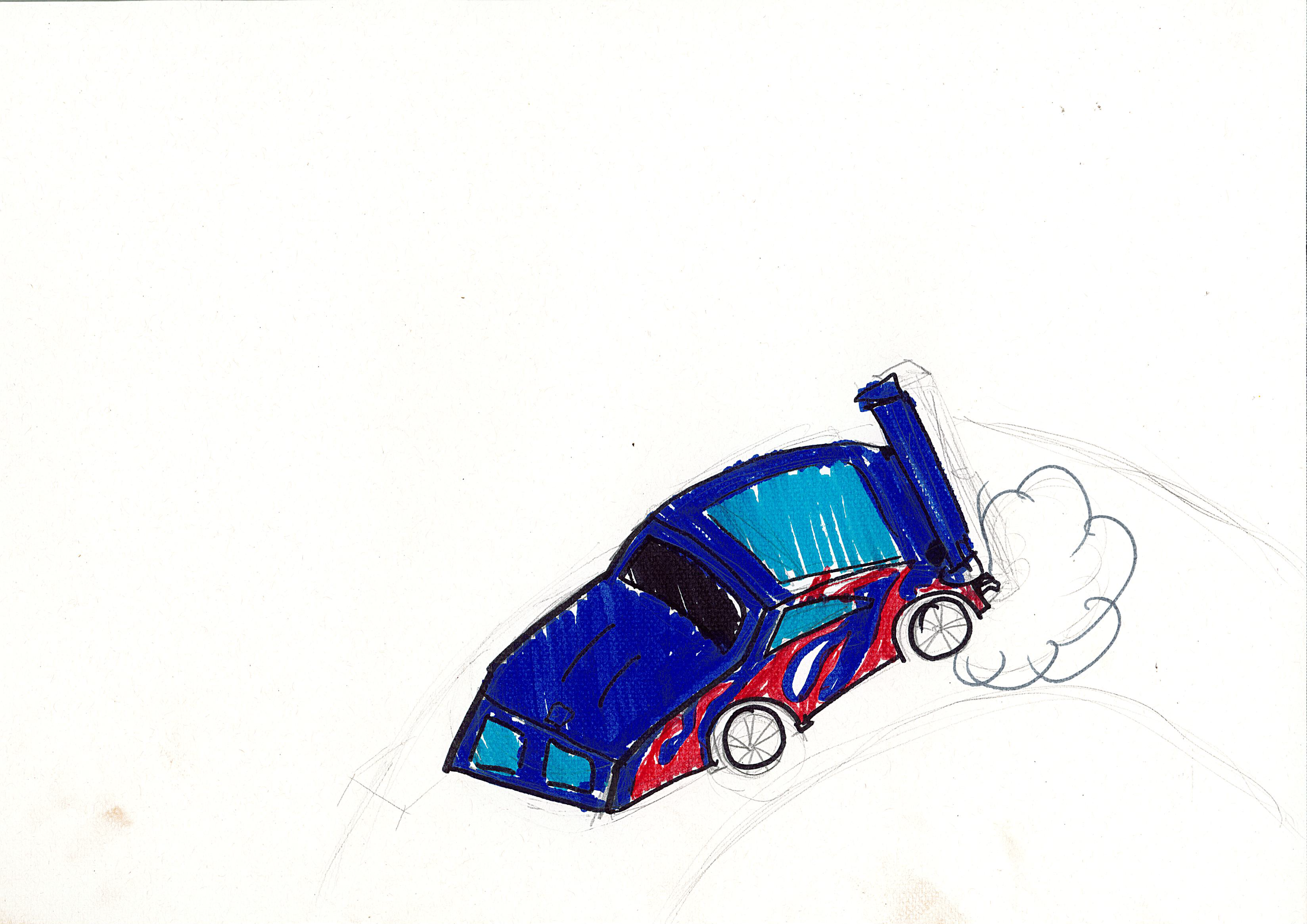 Une voiture est équipée de réacteurs anti-gravité situés sous le châssis, ce qui lui permet de décoller et de voler dans le ciel. Elle permet de voyager rapidement et en toute sécurité au-dessus des routes.