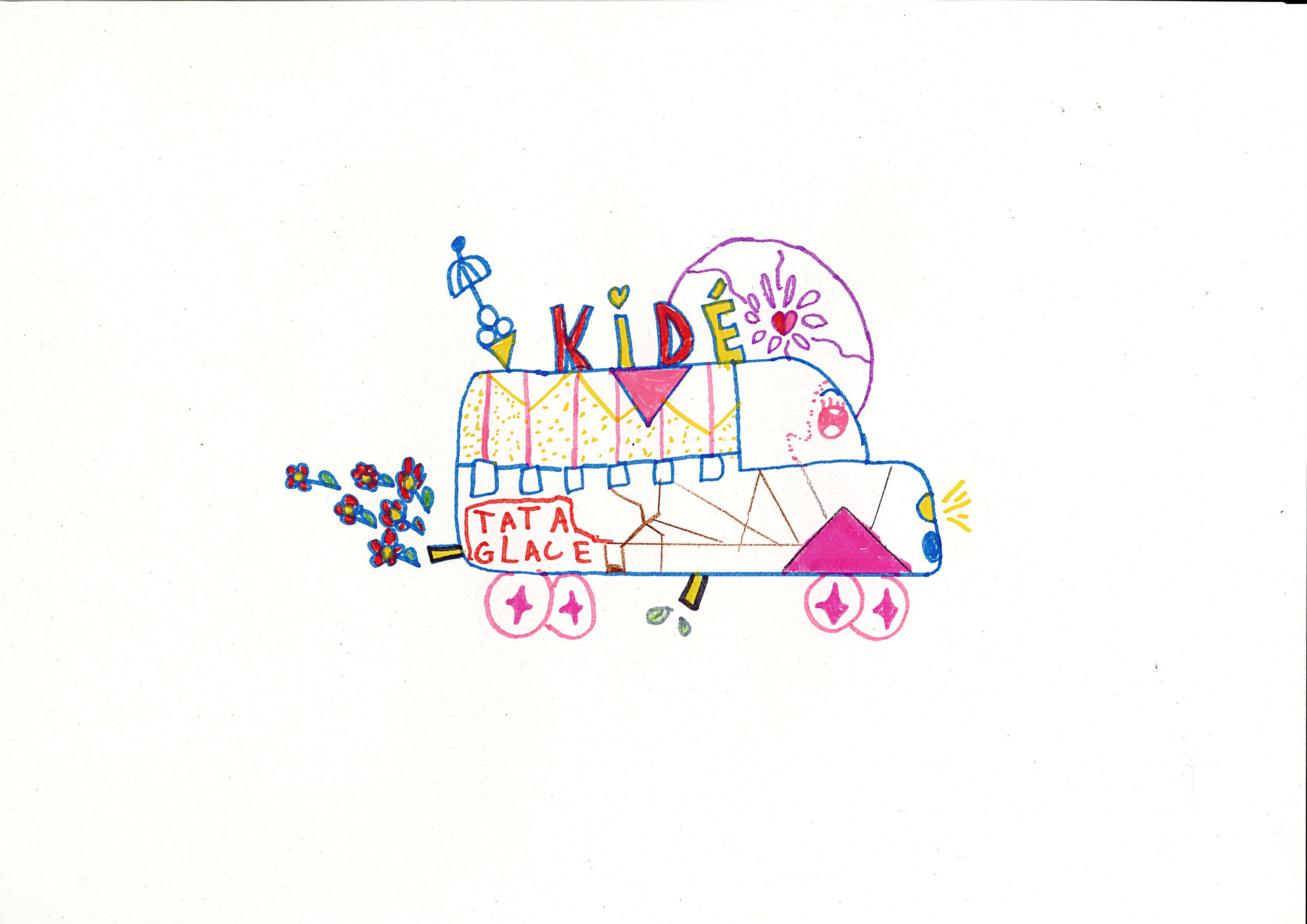 Une voiture multicolore qui diffuse de la lumière, distribue des fleurs et de la glace gratuitement